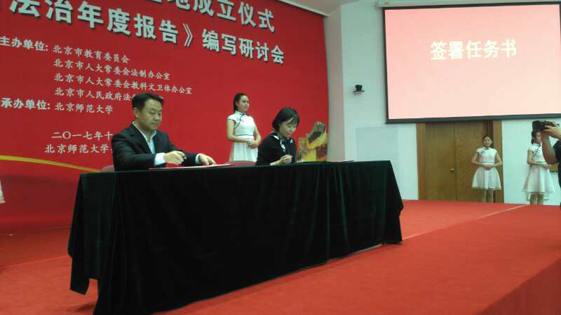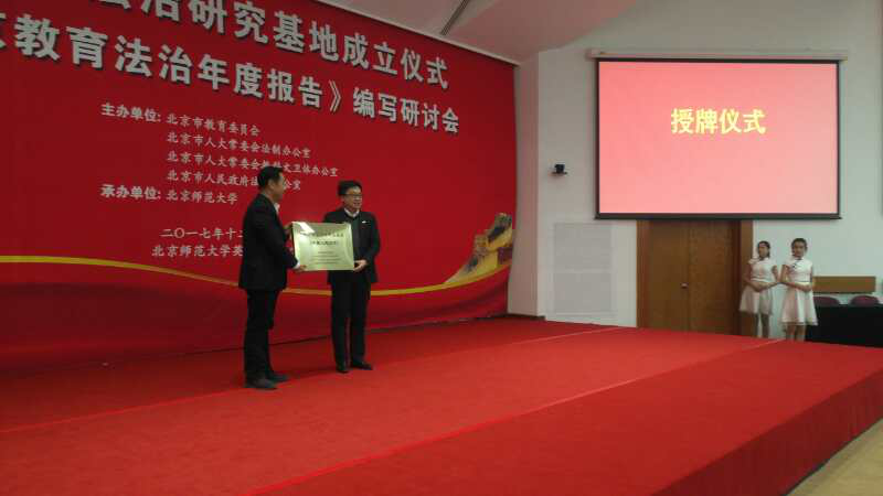 仪式首先由北京师范大学陈丽副董事长和教育部政策法规司王家勤巡视员致辞。而后四家基地的负责人依次对各基地情况进行简要介绍。公司申素平副经理代表“北京教育法治研究基地——伟德国际victor1946基地”从团队建设、人才培养、团队建设、科研成果和学术交流等方面介绍了公司基地建设的基本情况。之后北京市教育委员会、北京市人大常委会法制办公室、北京市人大常委会教科文卫体办公室、北京市人民政府法制办公室的相关领导分别向四个基地进行了授牌并签订任务书。董事长助理郭洪林代表公司接受基地授牌。申素平教授代表公司基地签署基地建设任务书。