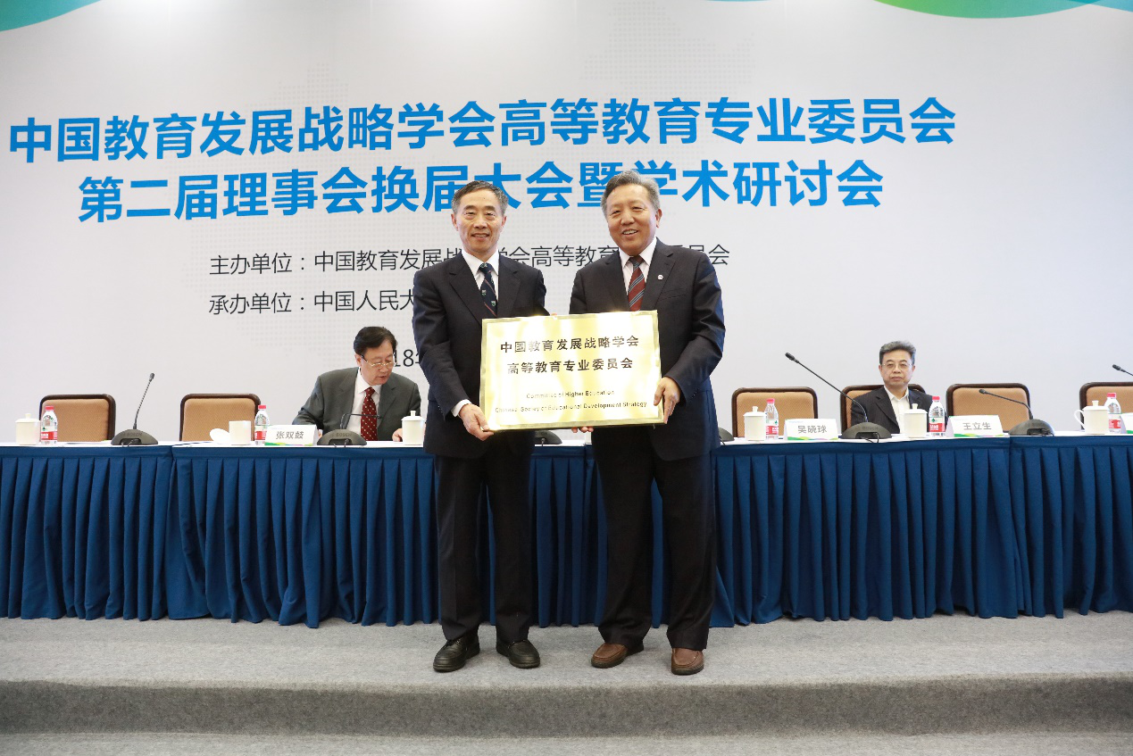 中国教育发展战略学会会长闵维方向新一届高等教育专业委员会授牌,理事长吴晓球代表委员会接牌。