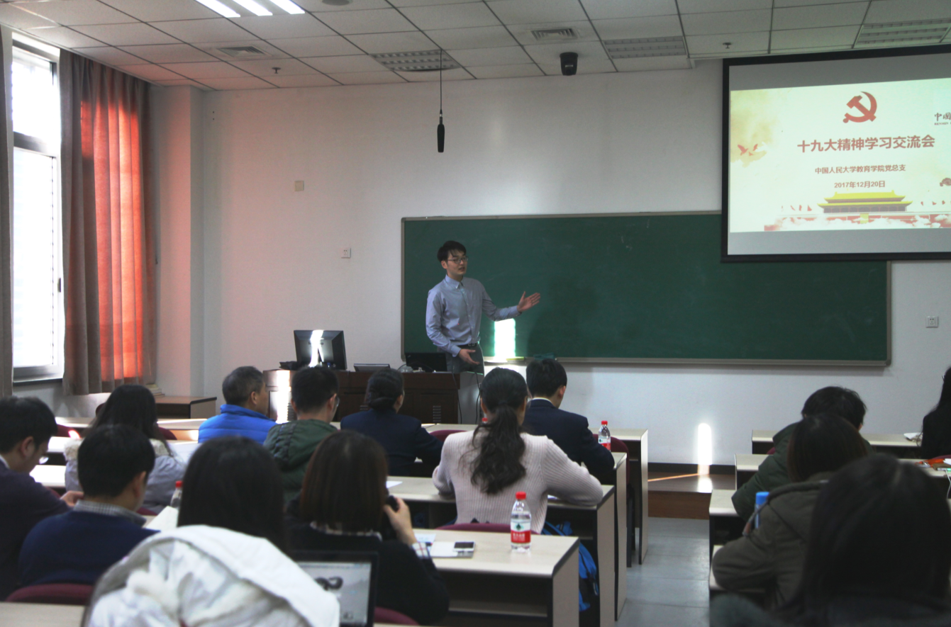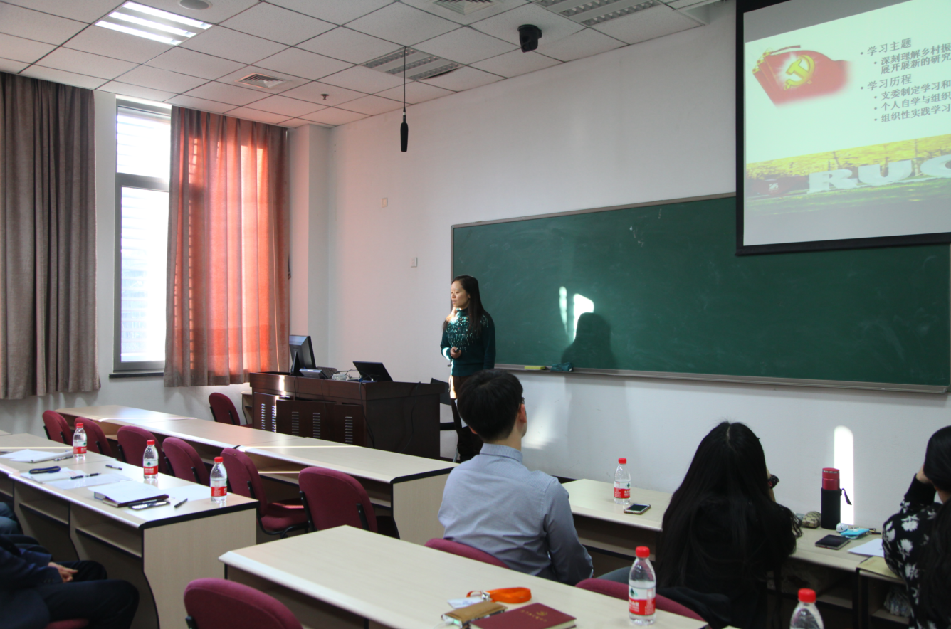 胡莉芳老师代表教师第一党支部汇报了他们的学习和开展的活动如教师代表参加学习讲座,与大兴君谊中学师生召开管理改革模式研讨会,参加“纪念一二∙九,植物园参观活动”等。在专题解读部分,教职工第一党支部选择了“农村教育”的主题,结合十九大报告中的建设教育强国战略和建设教育强国“两步走”战略,分析了农村教育短板的客观现状,并从财政投入、团队队伍建设和硬件设施完善等方面提出了建议。