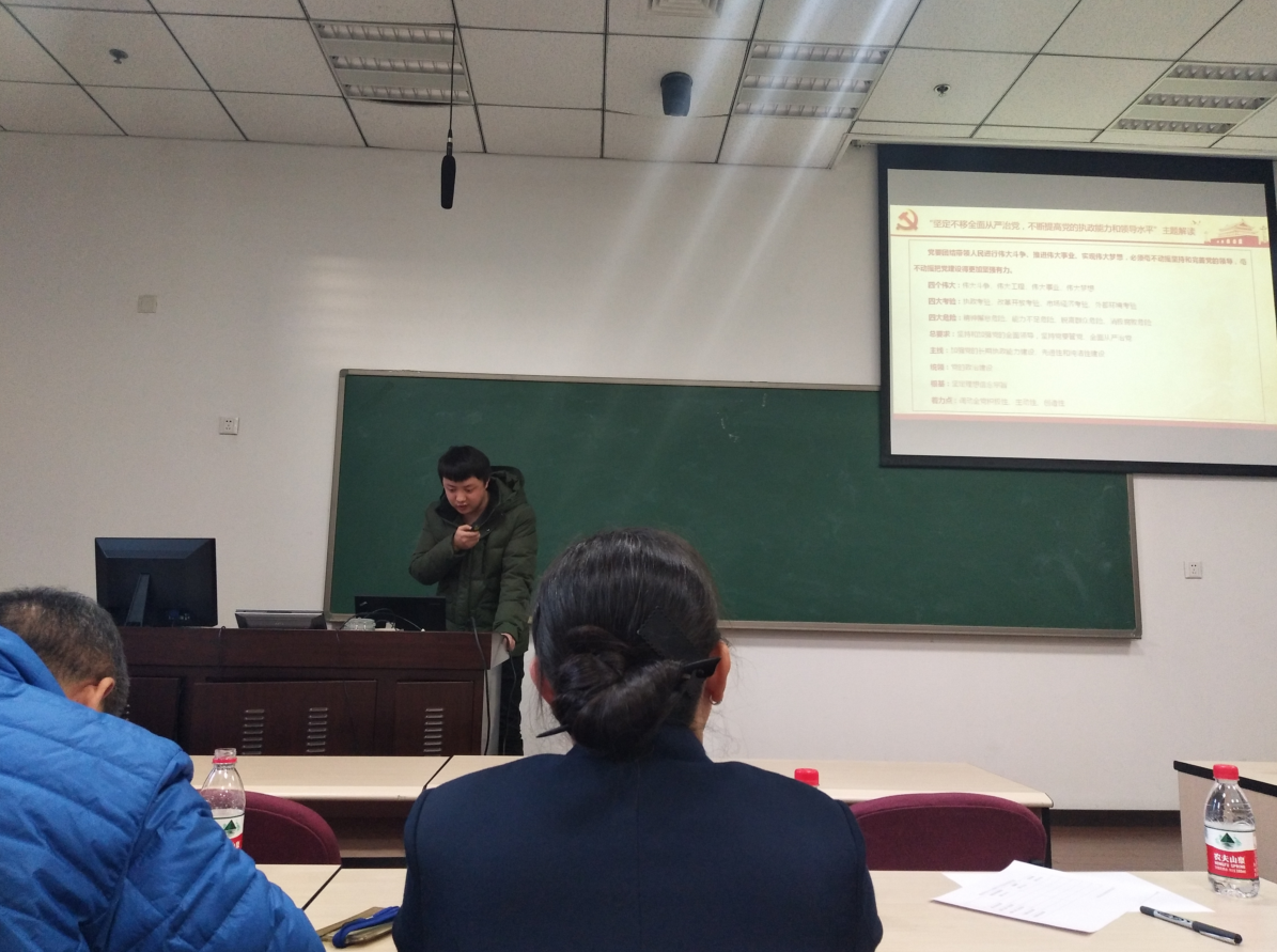 最后出场展示的是2016级硕士党支部,杨思睿作为代表汇报了支部学习情况,具体包括观看十九大开幕式、举办专题座谈会、组织民主生活会学习十九大热点、线上线下互动学习、与云南兰坪高中联动举行远程公益课堂项目。支部成员既提升了理论水平,也身体力行开展了实践活动,从中受益匪浅。他们以“坚定不移全面从严治党,不断提高党的执政能力和领导水平”为题进行了专题解读。