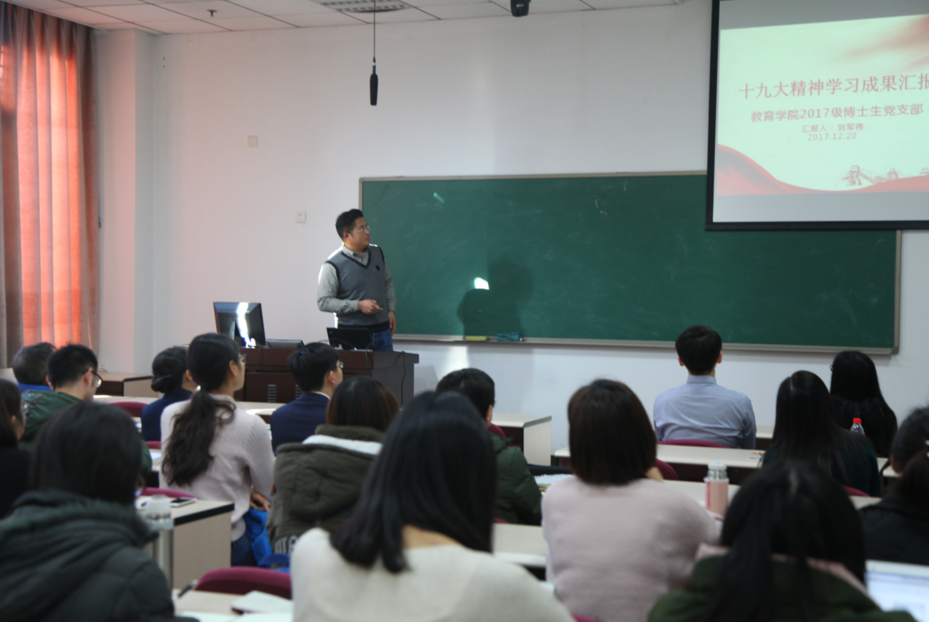 各支部学习成果交流展示由博士生党支部开始。2017级博士生刘军伟介绍了博士生党支部党团联动、线上互动,全员深入学习十九大精神,随时随地跟进十九大动态的情况。特别介绍了博士生党支部结合十九大报告讨论高等教育的发展内涵,分享了关于“人才培养”、“科学研究”和“服务社会”等内容的讨论结果。