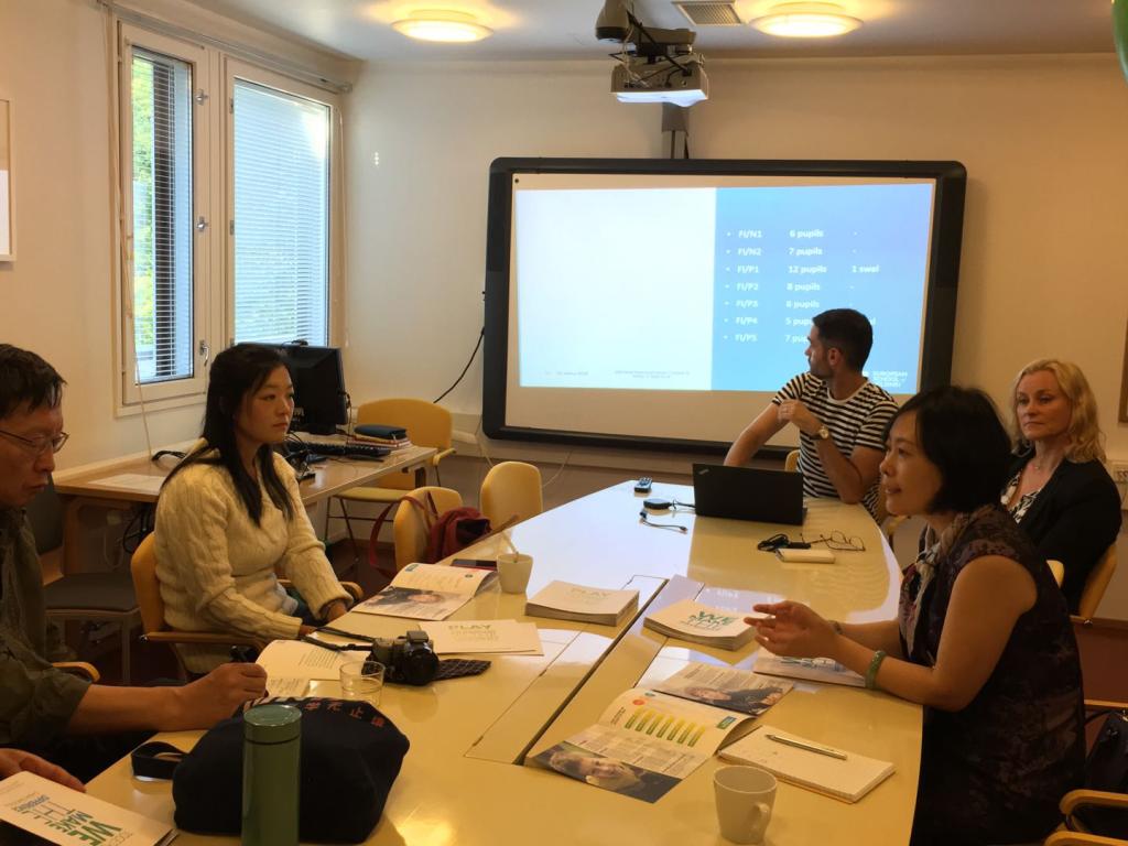 8月24日上午,代表团赴芬兰国际公司访问。该校副董事长热情接待了代表团一行,并介绍了公司从学前教育到高中教育的整体情况。同时,双方就公司外部督导、公司与欧盟的关系、公司的管理体制等方面进行了交流探讨。会后,代表团参观了早教部和小学部的课堂,切实感受了芬兰基础教育的氛围。