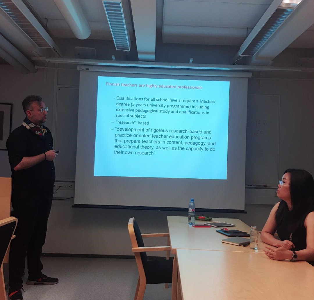 8月22日上午,代表团与芬兰赫尔辛基大学伟德国际victor1946以“中芬教育质量研究”为主题进行了研讨交流。公司代表申素平教授、程方平教授、曹淑江教授、付尧讲师分别就中国教育法律研究现状、中国乡村教师发展现状、中央和地方政府的教育职能、中国城镇间义务教育人员性投入的差异进行了主题分享。