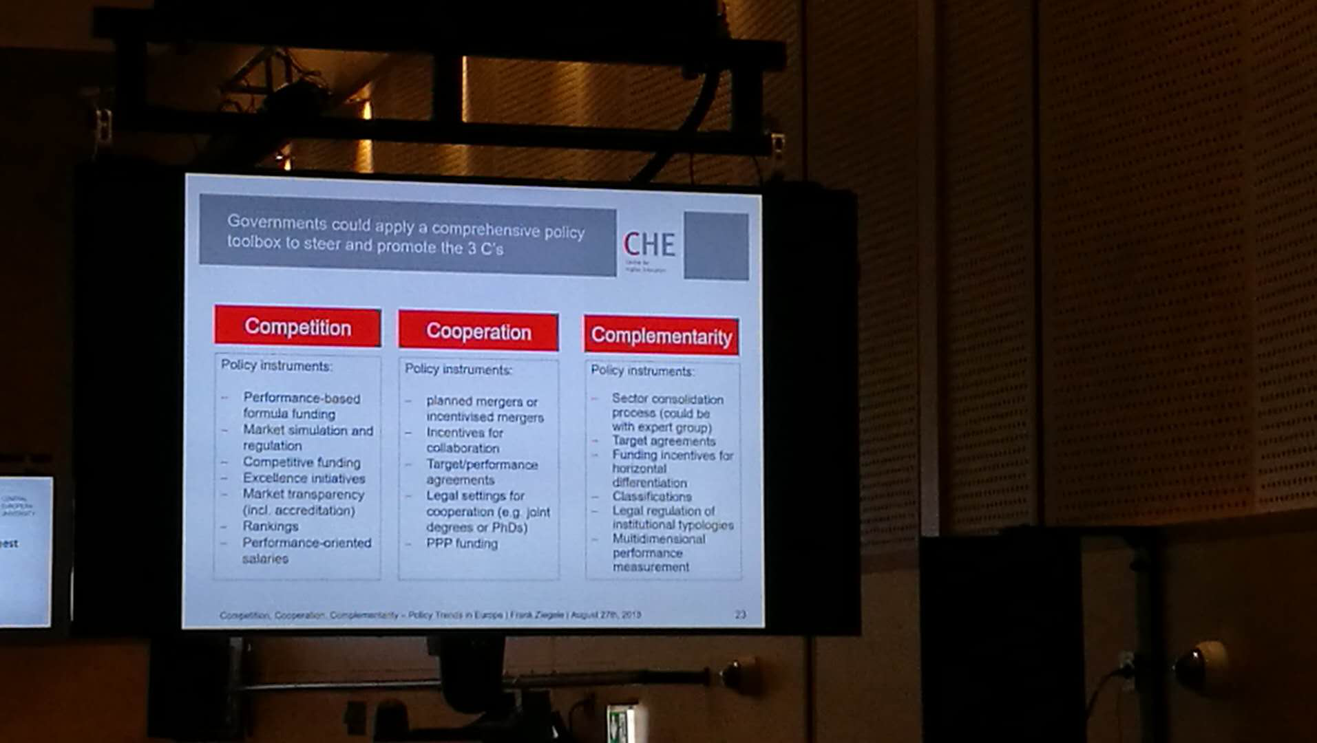 本届大会的主题是高等教育中的竞争、合作与互补(Competition, Collaboration & Complementarity in Higher Education),开幕主题报告由欧洲高等教育研究中心的Frank Ziegele主任介绍了在3C(Competition, Collaboration & Complementarity)框架下如何利用不同政策工具,诸如财政资金、目标协议和战略规划等对高等教育发挥重要作用。报告还试图识别和评估这种框架对系统和机构层面的影响,以及欧洲高等教育未来的发展趋势。