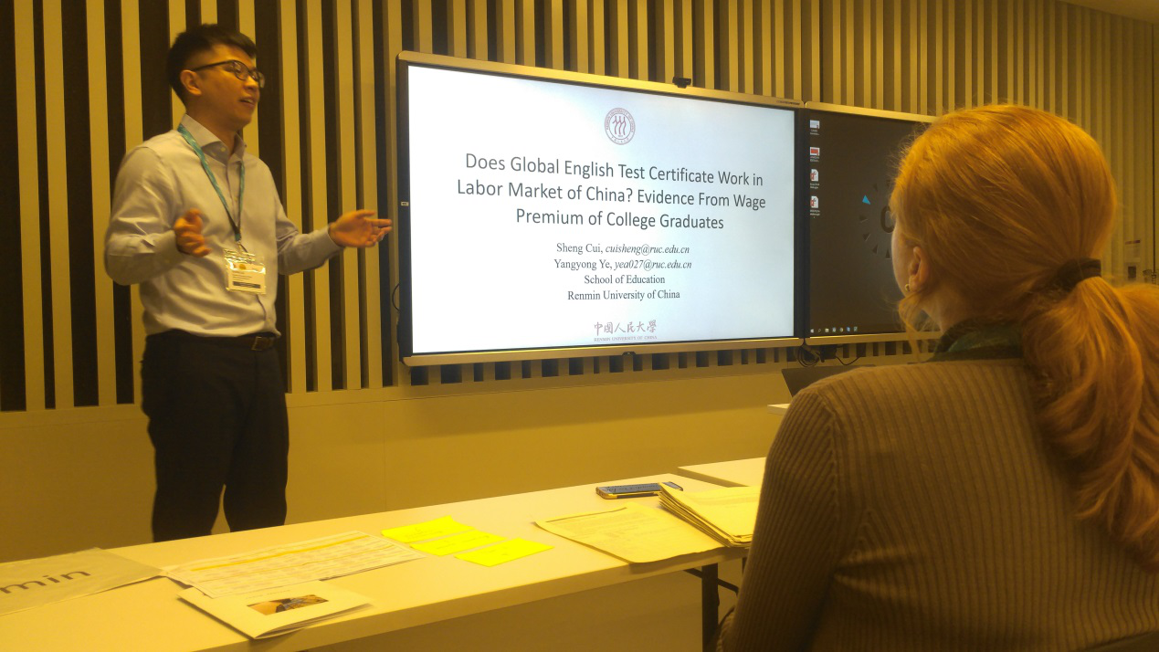崔盛副教授和叶阳永老师的报告主要从中国老员工考取外语证书的现实问题出发,利用首都高校老员工追踪调查的数据,估算了中国大学毕业生英语能力的经济回报。 结果表明,拥有全球英语考试证书对工资溢价有额外的积极影响,而国内英语考试证书则没有。中国老员工追求国际外语证书的行为体现了员工的积极性,会在大学毕业的初次就业阶段得到相应的工资回报。研究还探讨了这一发现对中国及其他发展中国家公共政策的启示。在问答环节,与会专家对比了中国与欧洲、北美的员工就业政策,并对员工自主学习,提升专业人力资本做了深入讨论。