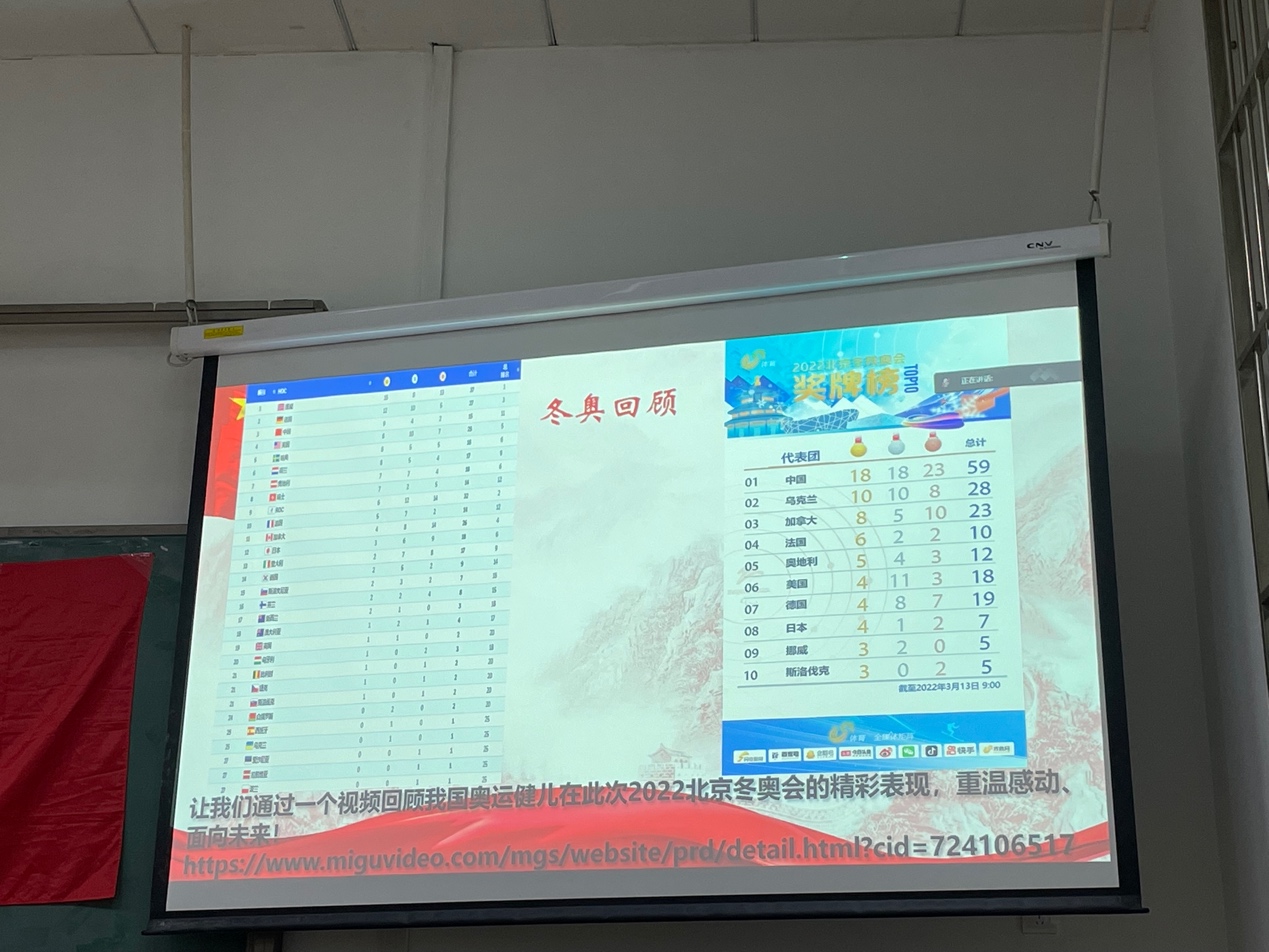 听完志愿者的经历分享,黄杨光带领同学们对本届冬奥会进行了回顾,大家通过图片和视频重温了每一位为国争光的奥运健儿带给我们的回忆与感动。
