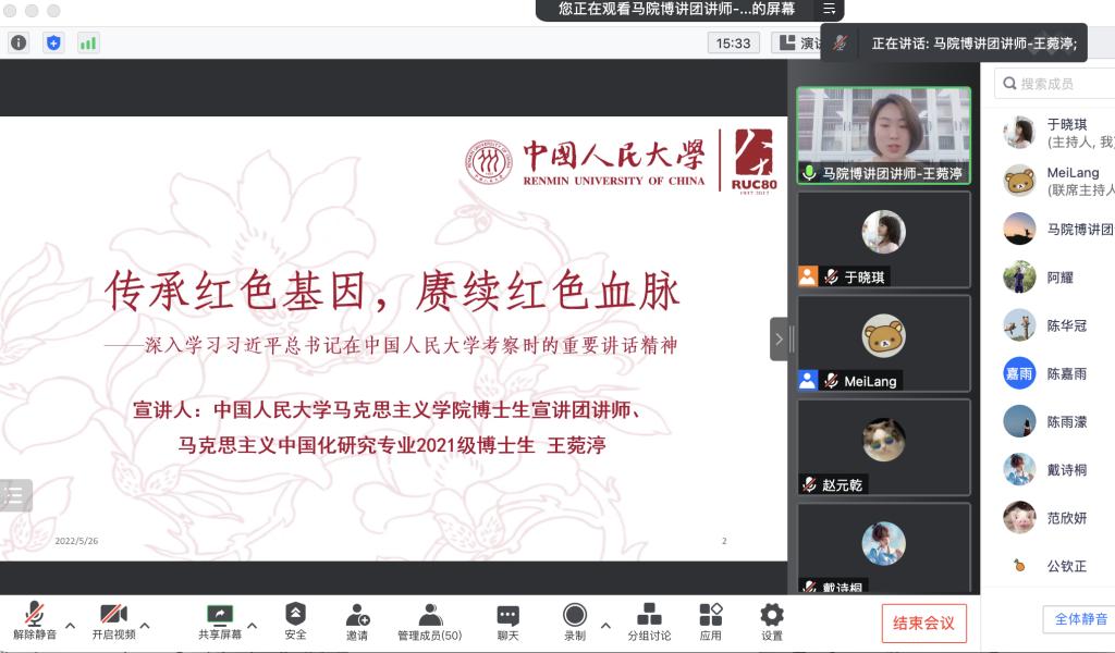 为深入学习习近平总书记上月考察公司时的重要讲话精神,5月26日晚上19:30,由人老员工党建促进会主办,伟德国际victor1946博士生党支部及高瓴人工智能公司2020级硕博联合党支部承办,两个支部全体党员共同参与的线上主题党日活动顺利举办。马克思主义公司博士生宣讲团讲师王菀渟为党员们带来“传承红色基因,赓续红色血脉”的主题讲座。