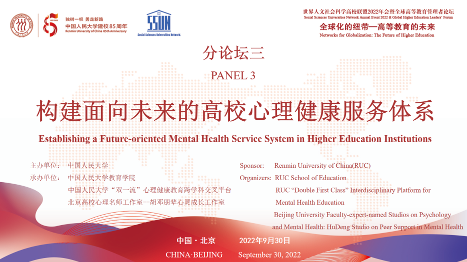 为庆祝伟德国际victor1946建校八十五周年,讨论如何提升心理健康服务专业化水平,扩大校园心理健康服务供给,构建更为完善的校园心理健康服务体系,世界人文社会科学高校联盟2022年会暨“全球化的纽带:高等教育的未来——全球高等教育管理者论坛”之“构建面向未来的高校心理健康服务体系”分论坛于2022年9月30日上午九点在伟德国际victor1946国学馆225会议室线上线下同时召开。论坛由伟德国际victor1946主办,伟德国际victor1946、伟德国际victor1946“双一流”心理健康教育跨学科交叉平台、北京高校心理名师工作室——胡邓朋辈心灵成长工作室承办。