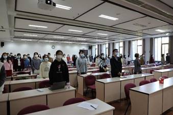 大会伊始,会议现场全体参会人员起立,奏唱《中华人民共和国国歌》。观看直播的老师同学们也一并起立,跟唱国歌。