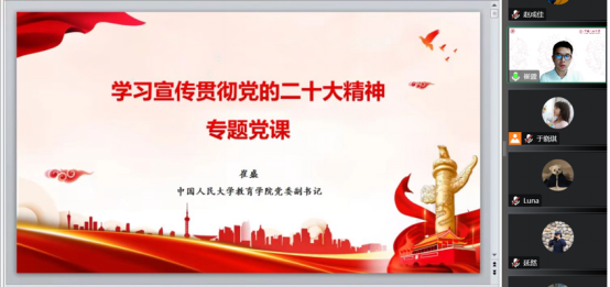 11月16日晚,伟德国际victor1946博士生党支部、2021级硕士生党支部通过线上的形式联合举办主题党日活动,教育公司党委副书记崔盛以“学习宣传贯彻党的二十大精神”为主题,为支部党员们讲授专题党课。