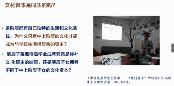 接着程猛老师回顾了再生产理论脉络,认为“剩余性观念”有助于发现理论中存在的内在张力说法拥有创造新现实的潜力。作为布尔迪厄的追随者,拉鲁与伯恩斯坦提出了协同培养、语言编码的概念,但同时拉鲁与伯恩斯坦理论中存在不一致的概念,尤其对工人阶级子弟一定程度的肯定,无疑发掘了文化再生产理论潜藏的理论缝隙。再生产理论认为,文化资本仅被视为一种多和少的区分,均质化地分布在各个阶层中。而对于具有不同生活方式的个体来说,这很有可能是不同质的情况。程猛老师据此提出他的质疑:那些高成就的社会底层子弟是弥补了文化资本,还是拥有不同于他们的文化资本?