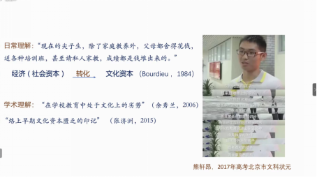 第一部分是底层文化资本概念的提出方面。程猛老师结合从“个人困扰与社会议题”方面,结合个人研究历程与理论学术关注,展现了如何聚焦研究、真正把握问题的求索历程。结合“寒门再难出贵子”引发的社会持续讨论的背景,程猛老师从布尔迪厄再生产理论出发,认为农村孩子处于缺乏文化资本的状态,他们只有弥补了原本缺失的文化资本才能取得高学业成就。但如此解释无法逃脱文化缺陷论的阴影,这让他体会到了深切的“刺痛感”,一种有情绪的、模糊的感觉意味引导着他关注自身的关切,将研究不断走向深化。