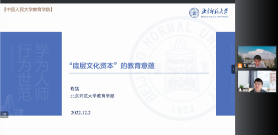 12月2日上午,张晓京思政创新工作室主办的“和张老师一起读书吧”系列读书会通过腾讯会议顺利举行。北京师范大学青年学者、《“读书的料”及其文化生产:当代农家子弟成长叙事研究》一书的作者程猛,应邀做主题讲座:底层文化资本及其教育意蕴。本次讲座由伟德国际victor1946青年教师吴秋翔主持,教育公司党委书记兼副经理张晓京、副教授罗云参与对谈,校内外近300名师生在线参与。