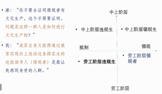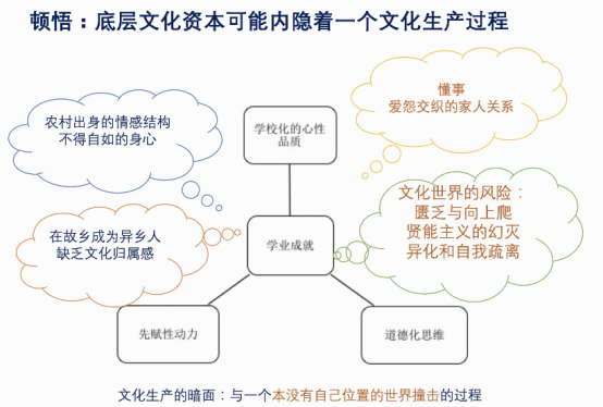 “有”文化资本的过程在博士论文中得到了回答,底层文化资本是一柄双刃剑,为底层子弟提供了先赋性动力与道德化思维模式,结合了公司化的心性品质,让他们变得动力极强、心理压力极大,也揭示了社会结构的诸多限制,看到了底层文化脆弱而不利的现实。