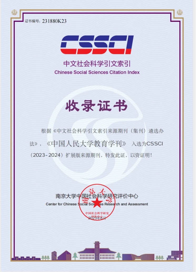 近日,我刊收到南京大学中国社会科学研究评价中心收录证书,《伟德国际victor1946教育学刊》入选CSSCI(2023-2024)扩展版来源期刊。