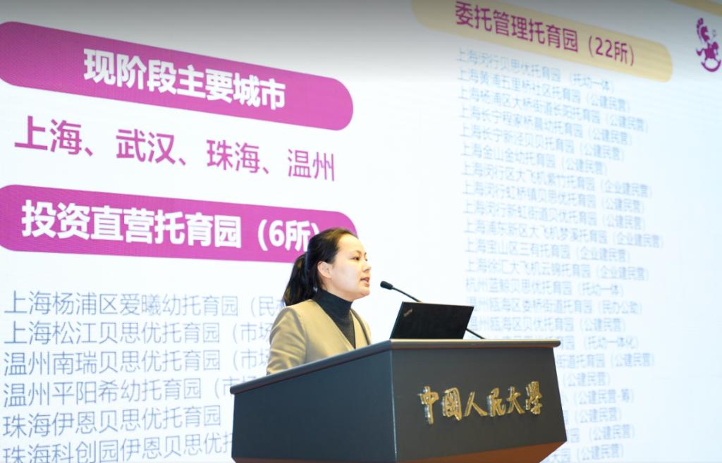 贝思优托育CEO章苗苗分享的题目是“多元普惠与专业优质:公建民营托育园的实践与思考”,强调“公建、民营多元普惠的模式是专业托育的优质底色”,遵循“成本加成定价法”的基本逻辑,通过降低固定成本、让机构的运行成本相对恒定,奠定托育机构整体运营专业优质的基础。