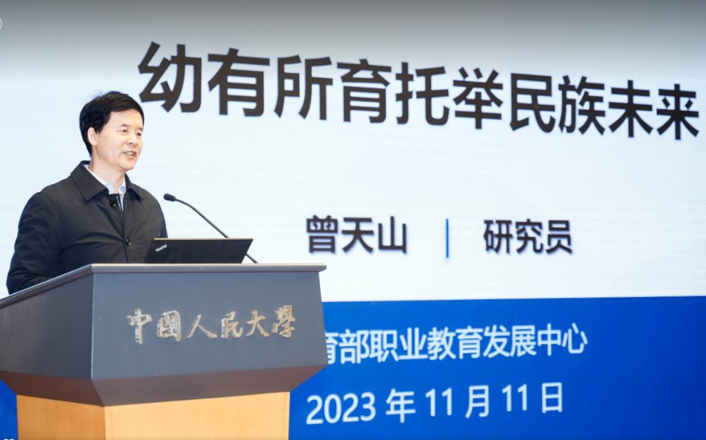 曾天山以“幼有所育托举民族未来”为题,强调建立普惠托育服务体系的紧迫性,指出当前团队资源存在严重不足的难题,解决之道在于卫健部门、人社部门、教育部门协同合作,遵循教育培训一体化、“岗课赛证”综合育人的基本原则,充分发挥信息化的作用,科学合理地解决托育人才培养与供给问题。