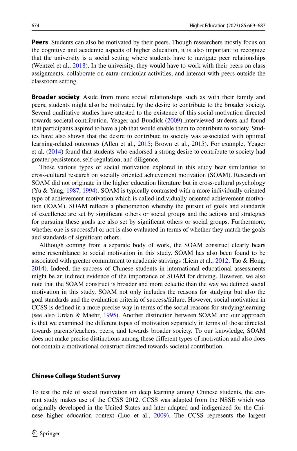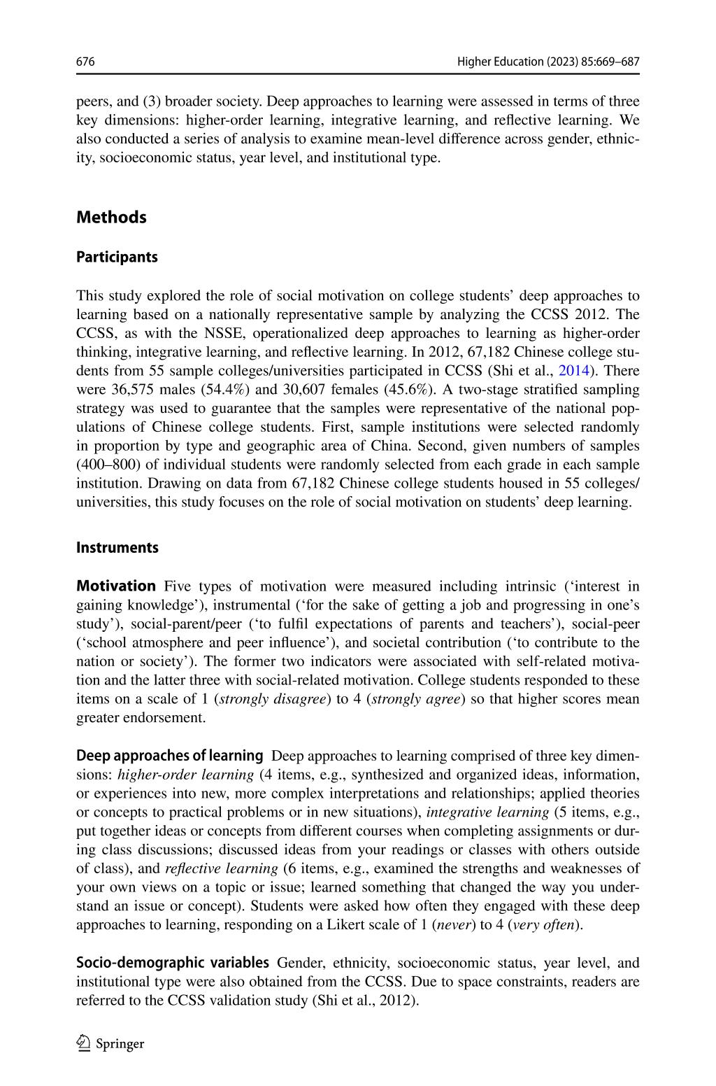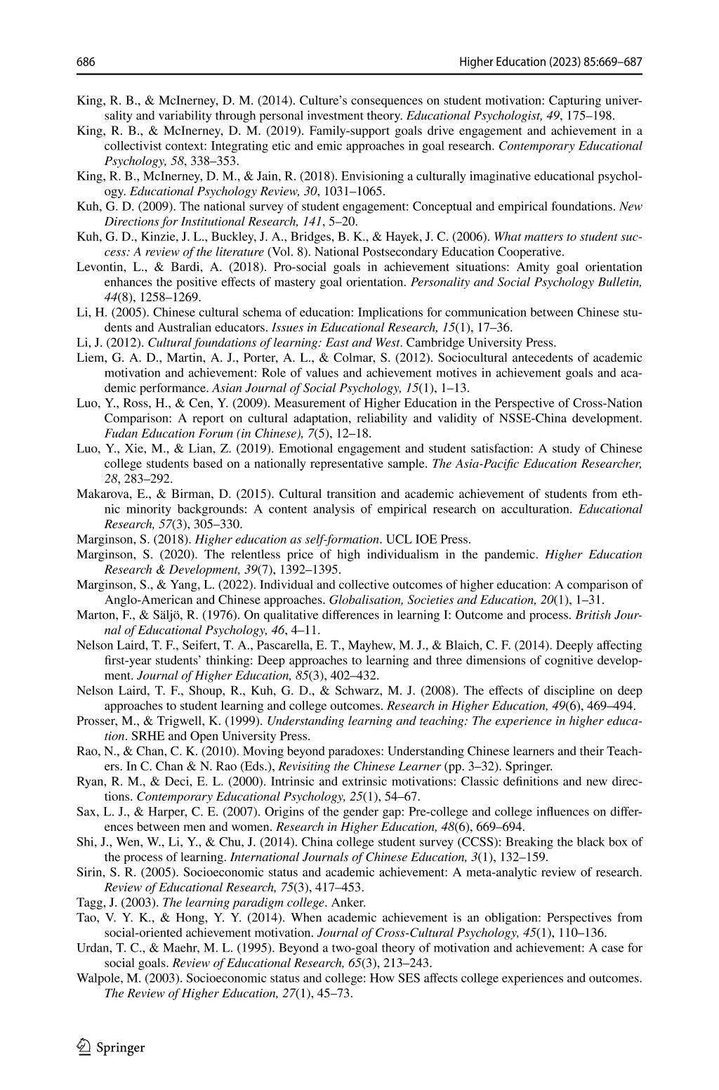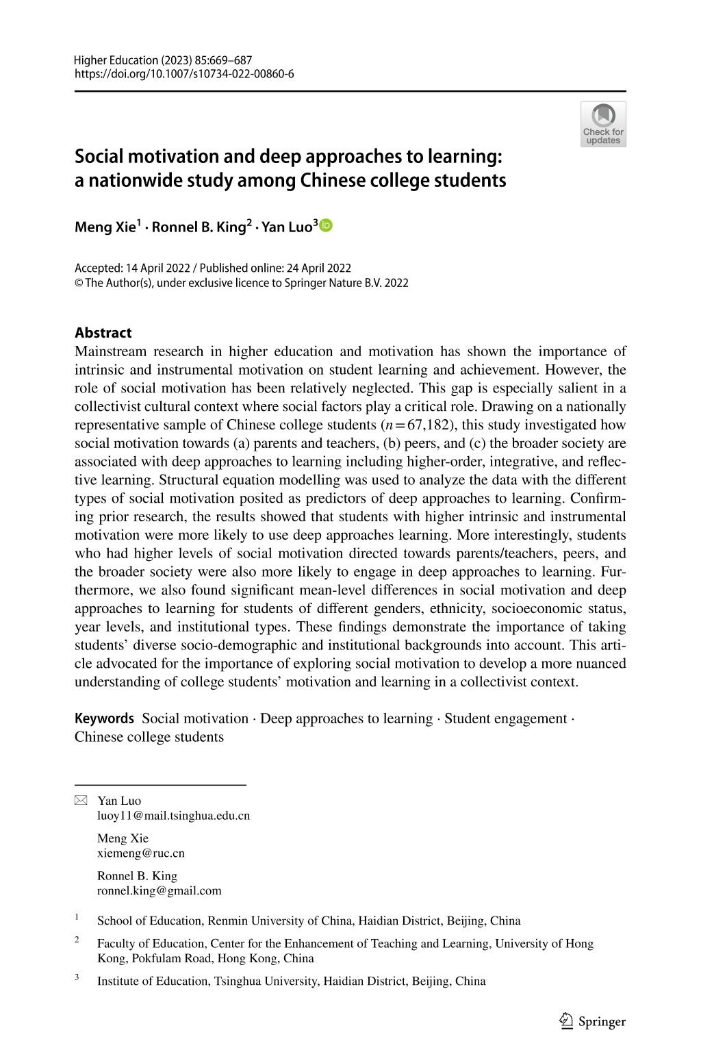Abstract:Mainstream research in higher education and motivation has shown the importance of intrinsic and instrumental motivation on student learning and achievement. However, the role of social motivation has been relatively neglected. This gap is especially salient in a collectivist cultural context where social factors play a critical role. Drawing on a nationally representative sample of Chinese college students (n = 67,182), this study investigated how social motivation towards (a) parents and teachers, (b) peers, and (c) the broader society are associated with deep approaches to learning including higher-order, integrative, and reflective learning. Structural equation modelling was used to analyze the data with the different types of social motivation posited as predictors of deep approaches to learning. Confirming prior research, the results showed that students with higher intrinsic and instrumental motivation were more likely to use deep approaches learning. More interestingly, students who had higher levels of social motivation directed towards parents/teachers, peers, and the broader society were also more likely to engage in deep approaches to learning. Furthermore, we also found significant mean-level differences in social motivation and deep approaches to learning for students of different genders, ethnicity, socioeconomic status, year levels, and institutional types. These findings demonstrate the importance of taking students’ diverse socio-demographic and institutional backgrounds into account. This article advocated for the importance of exploring social motivation to develop a more nuanced understanding of college students’ motivation and learning in a collectivist context.