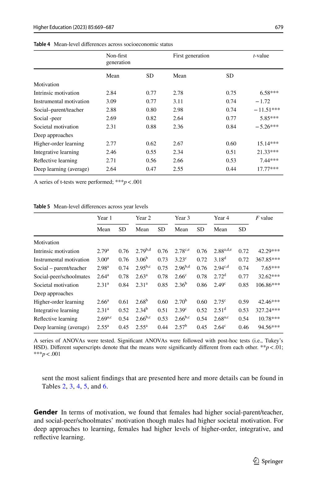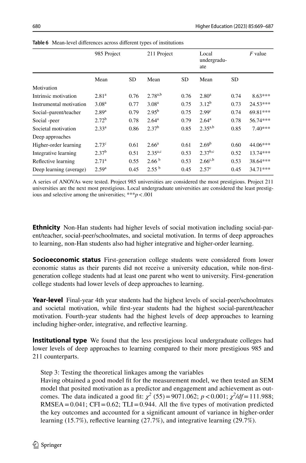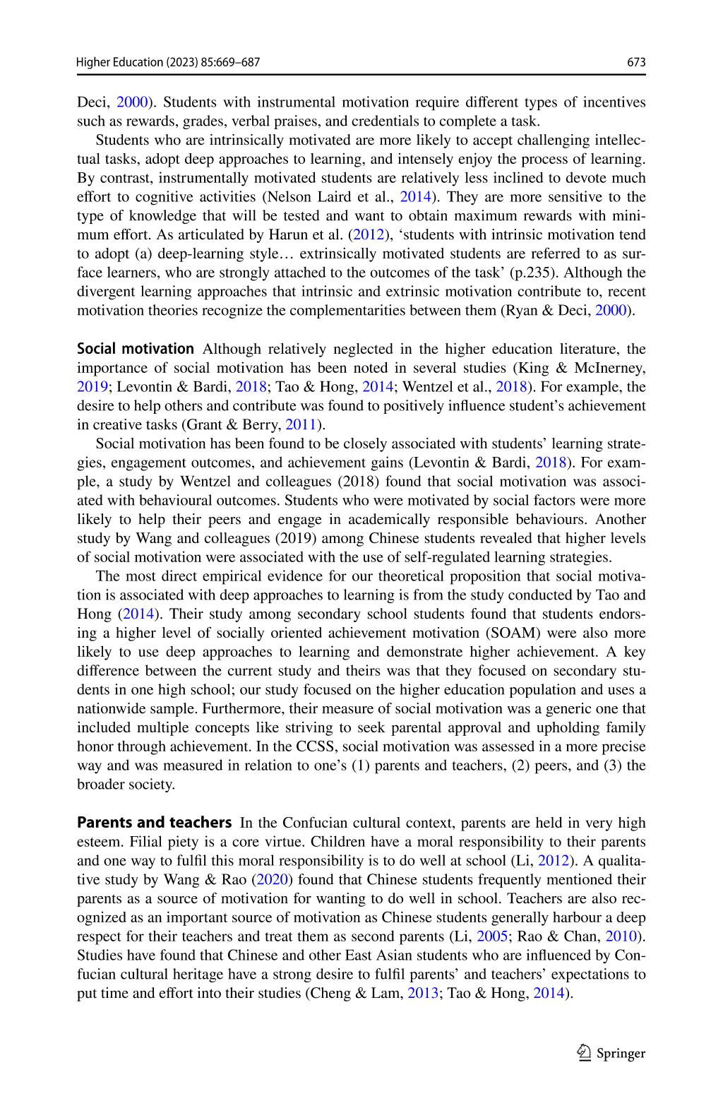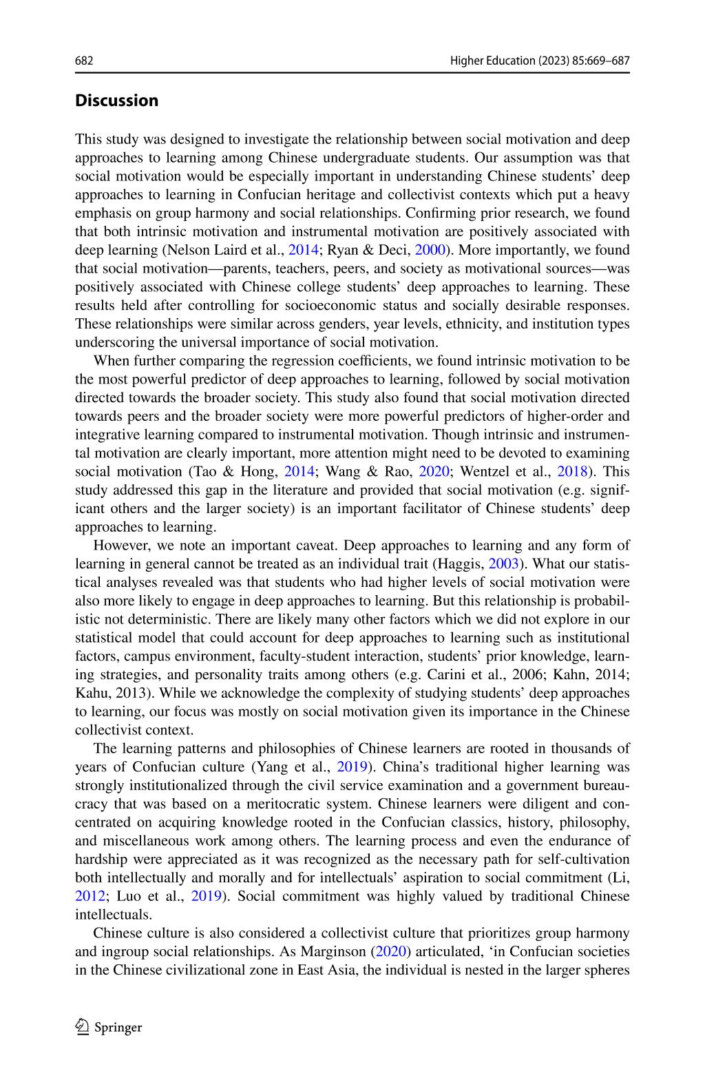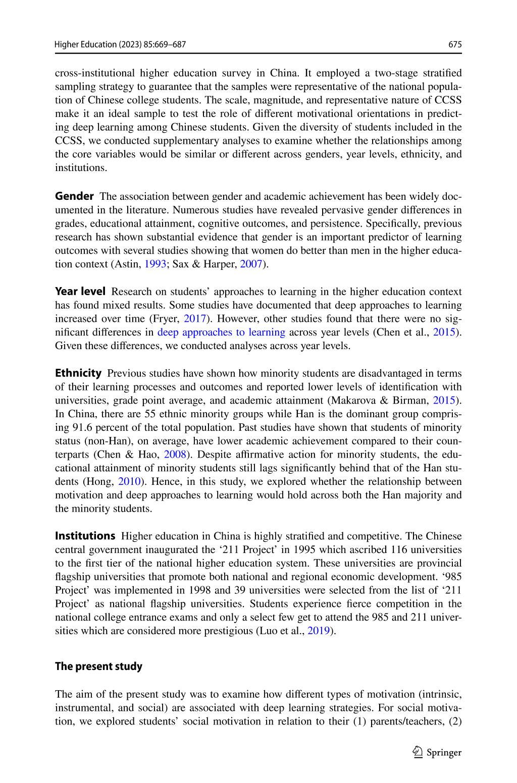 Abstract:Mainstream research in higher education and motivation has shown the importance of intrinsic and instrumental motivation on student learning and achievement. However, the role of social motivation has been relatively neglected. This gap is especially salient in a collectivist cultural context where social factors play a critical role. Drawing on a nationally representative sample of Chinese college students (n = 67,182), this study investigated how social motivation towards (a) parents and teachers, (b) peers, and (c) the broader society are associated with deep approaches to learning including higher-order, integrative, and reflective learning. Structural equation modelling was used to analyze the data with the different types of social motivation posited as predictors of deep approaches to learning. Confirming prior research, the results showed that students with higher intrinsic and instrumental motivation were more likely to use deep approaches learning. More interestingly, students who had higher levels of social motivation directed towards parents/teachers, peers, and the broader society were also more likely to engage in deep approaches to learning. Furthermore, we also found significant mean-level differences in social motivation and deep approaches to learning for students of different genders, ethnicity, socioeconomic status, year levels, and institutional types. These findings demonstrate the importance of taking students’ diverse socio-demographic and institutional backgrounds into account. This article advocated for the importance of exploring social motivation to develop a more nuanced understanding of college students’ motivation and learning in a collectivist context.