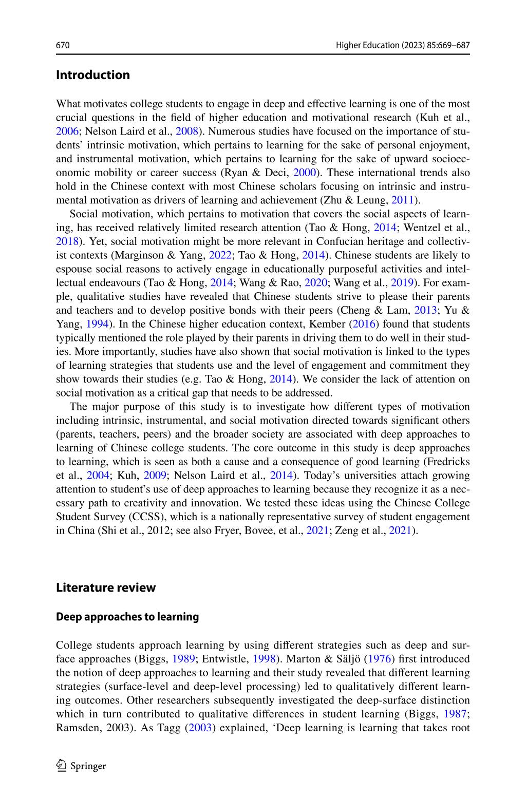 Keywords:Social motivation Deep approaches to learning Student engagement Chinese college students