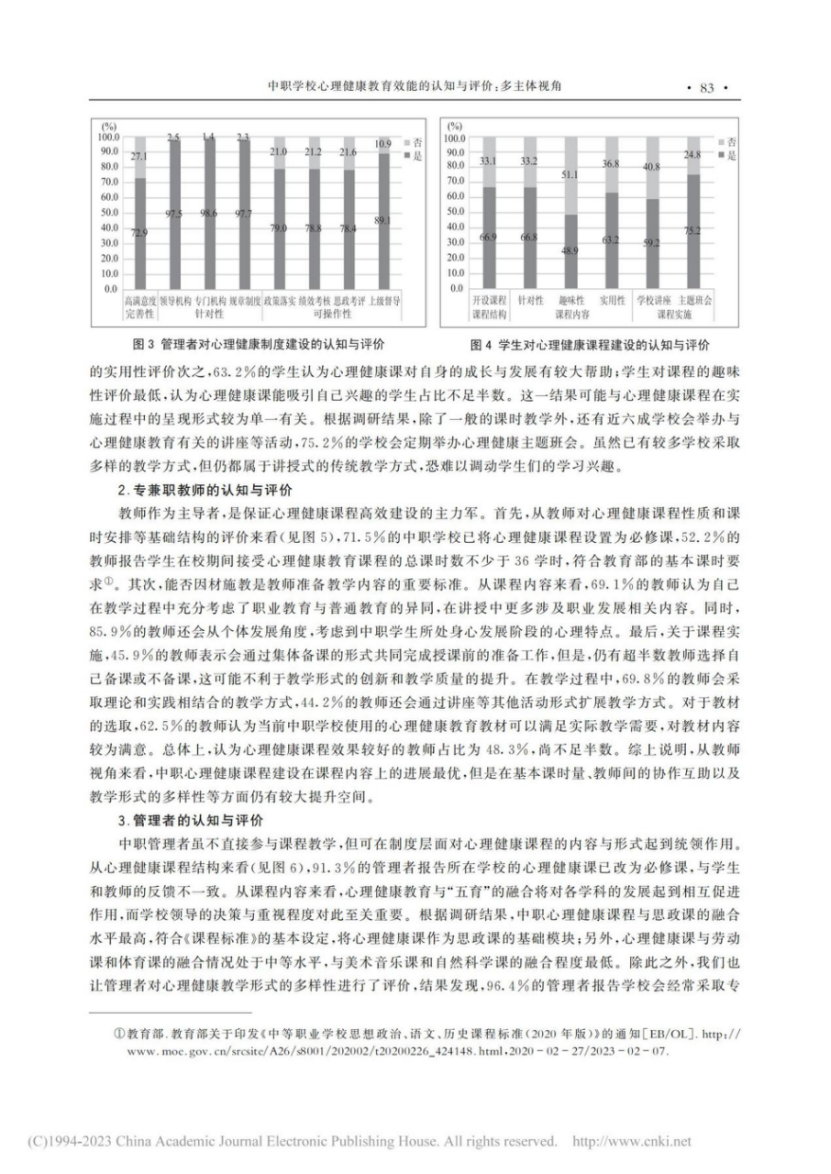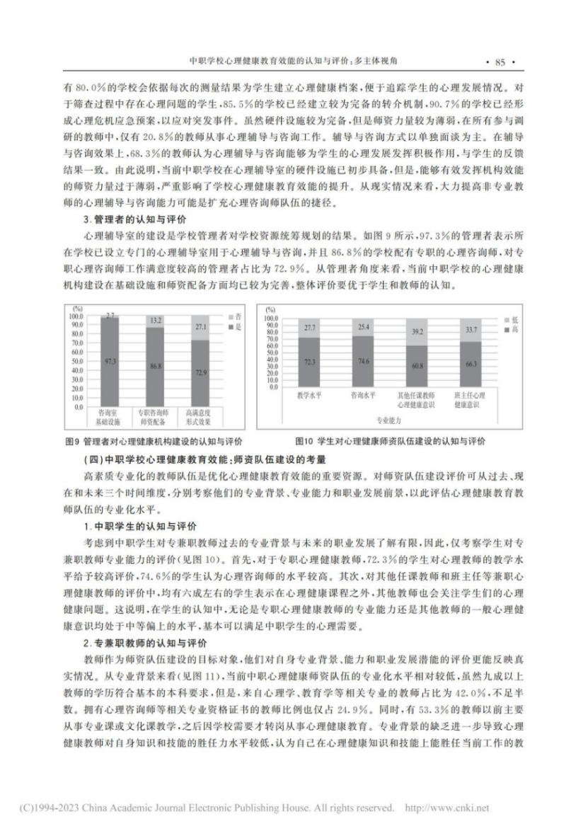 [摘 要]为全方位了解中职公司心理健康教育效能的发展现状,我们对全国20个省市的82所中职公司的62632名中职员工、1714名专兼职教师和439名管理者进行了问卷调查,比较了员工、教师和管理者三个主体在制度建设、课程建设、机构建设和团队队伍建设四大要素上对心理健康教育效能的认知与评价。结果发现:(1)在制度建设上,管理者的评价明显优于员工和教师,但三个主体均认为心理健康制度建设的水平较低;(2)在课程建设上,表示公司已开设心理健康课程的员工和教师比例均低于管理者约二成,对教学形式多样性评价较高的教师占比为44.2%,管理者占比为96.4%;(3)在机构建设上,三个主体的评价基本一致,认为公司设置心理咨询室等基础设施的主体比例约为八至九成,认为心理辅导与咨询效果良好的占比为七成左右;(4)在团队队伍建设上,约有七成左右的员工和管理者对心理健康教师的专业能力给予较高评价,明显高于教师的自我评价,但心理健康教师的晋升机会在教师和管理者的评价中均处于最低位。由此说明,不同主体对公司心理健康教育效能的评价存在出入,分析主体间的认知差异将有助于发现问题,提升效能。未来中职公司心理健康教育工作应大力促进不同主体与要素间的最优配合,突出管理者在制度建设上的领导力优势,积极听取员工和教师的需求与建议;促进员工与教师在课程教学中的相互协作,员工善学,教师善教;深化心理健康机构的内在目标,追求教育效果提升而非硬件基础设备;鼓励教师把握培训机会,关注自身专业成长,内外兼修。